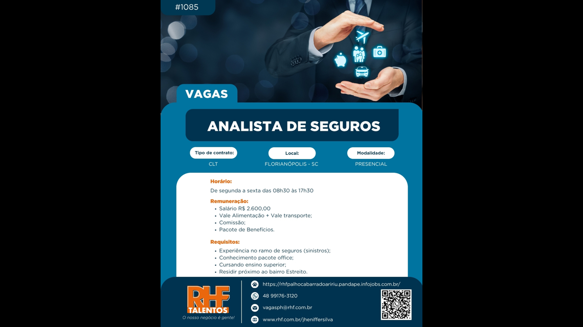 Corretora que atua com excelência em todos os ramos de seguros, oferecendo atendimento personalizado e soluções completas para cada cliente. Estamos à procura de um(a) Analista de Seguros comprometido(a), organizado(a) e com perfil analítico para integrar a equipe!