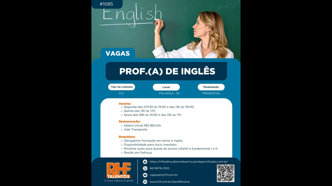 Estamos em busca de Professor(a) de Inglês para atuar com turmas do Ensino Infantil e Ensino Fundamental I e II, em instituição localizada em Palhoça/SC.