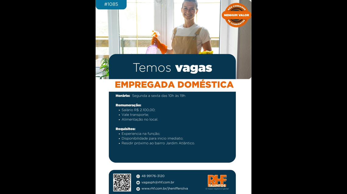 Estamos à procura de uma profissional cuidadosa, organizada e com experiência, que possa contribuir com a rotina da casa e com o cuidado das crianças!